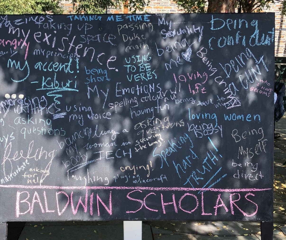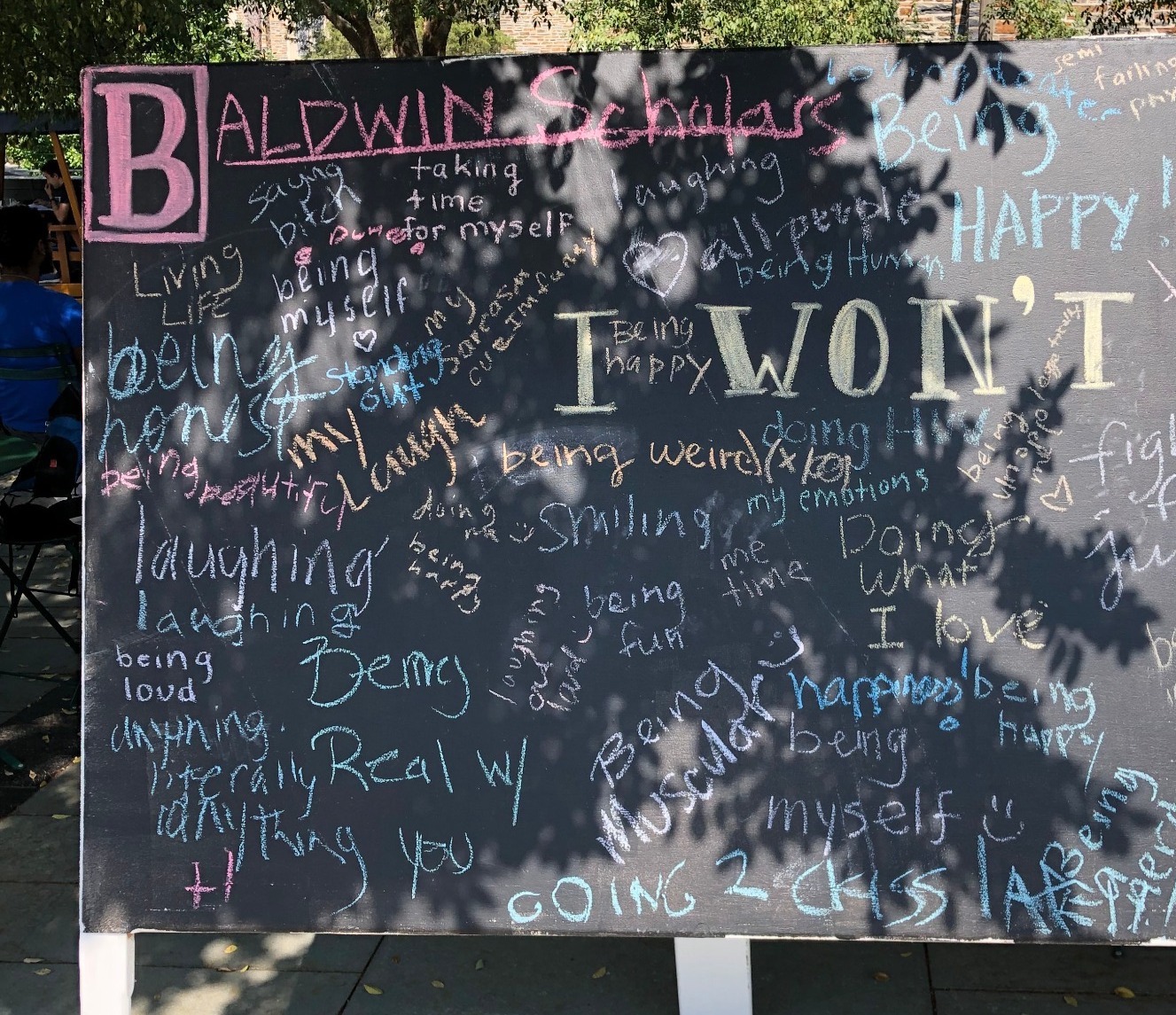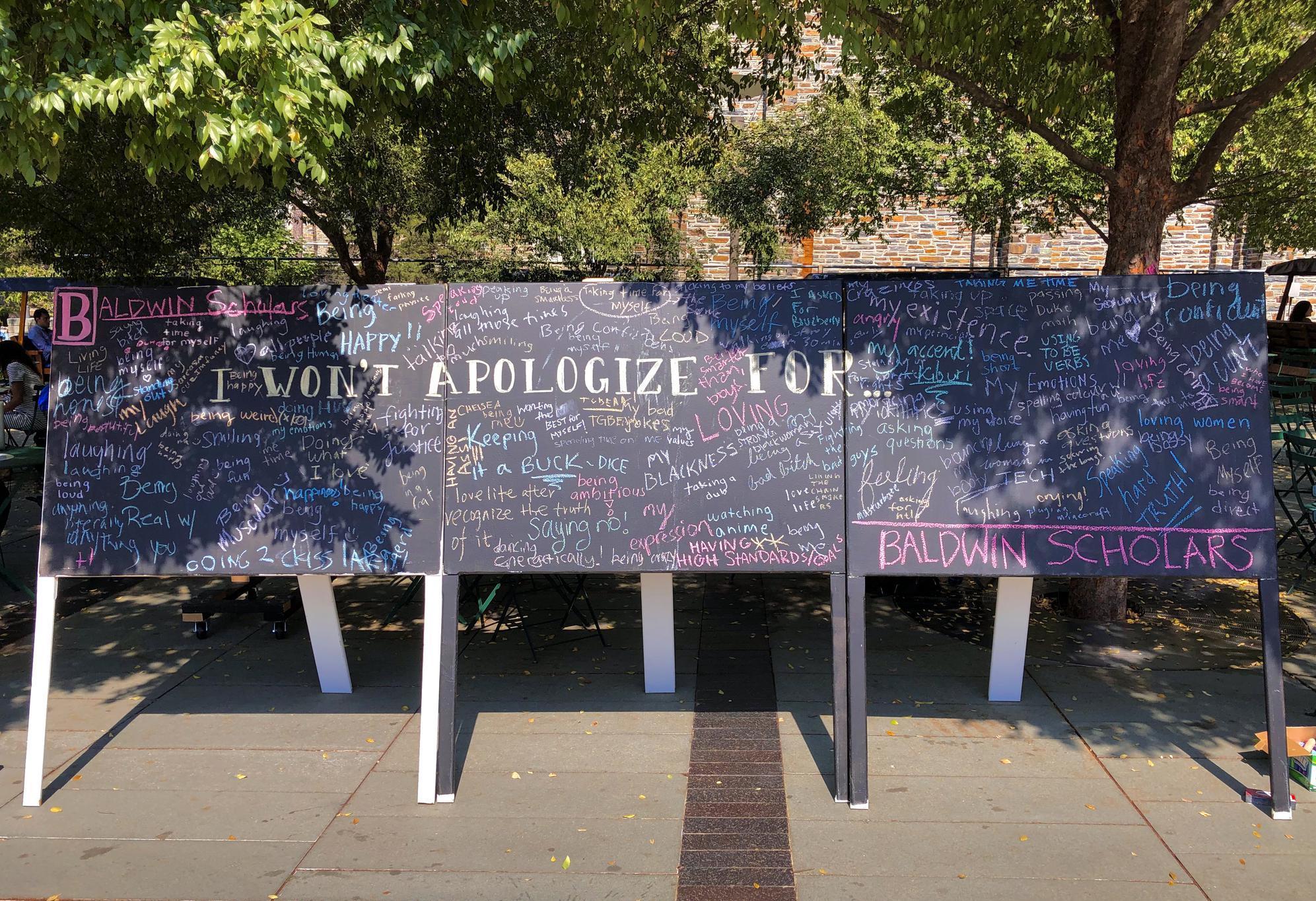 As an Alice M. Baldwin Scholar, my mission is to lead with confidence and compassion and inspire others to do the same. That's why I organized this public chalkboard-writing event. In life, we're often made to apologize for the things that make us who we are—especially those of us who hold marginalized identities. With this event, I wanted to turn that on its head, asking instead: What won't you apologize for?