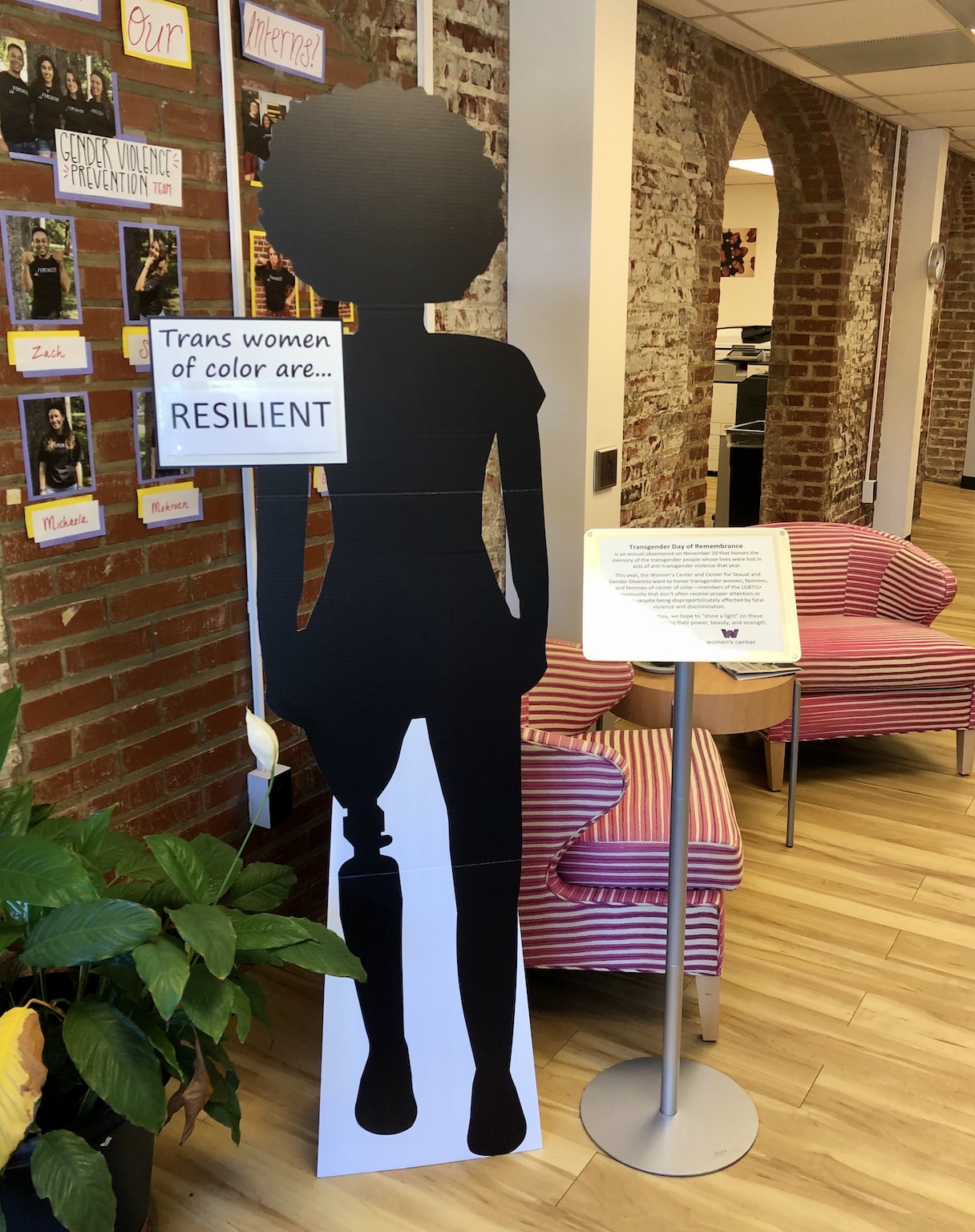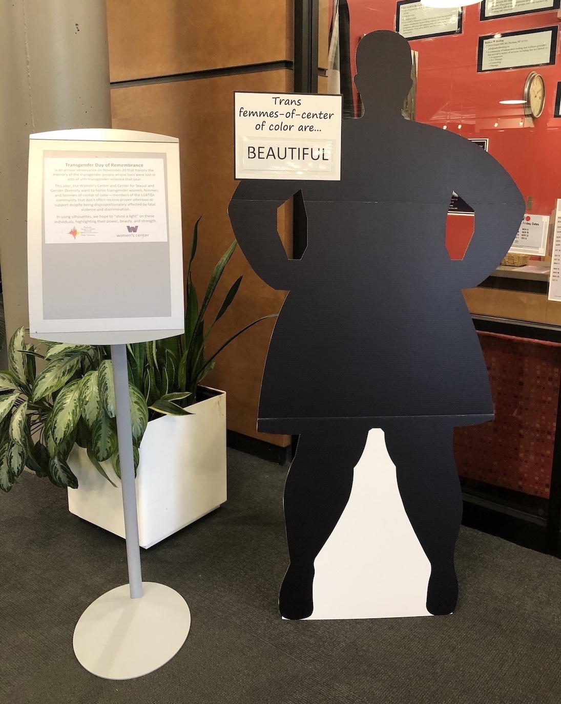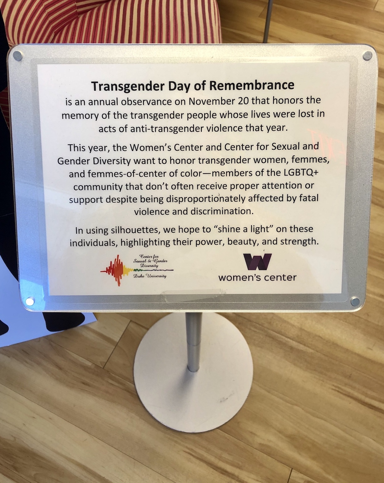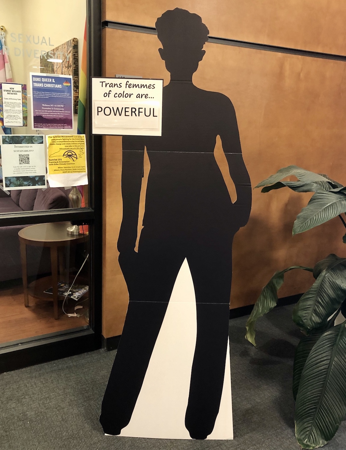 As part of my internship with the Duke University Women's Center, I collaborated with staff at the Center for Sexual and Gender Diversity to design three cardboard silhouettes representing transgender women, femmes, and femmes-of-center of color for Transgender Day of Remembrance, an annual observance held on November 20 that honors the lives lost to anti-transgender violence that year. In using silhouettes, I hoped to "shine a light" on these individuals' power, resilience, and beauty while also underscoring the injustice they face as one of the most marginalized yet overlooked groups within the LGBTQIA+ community.